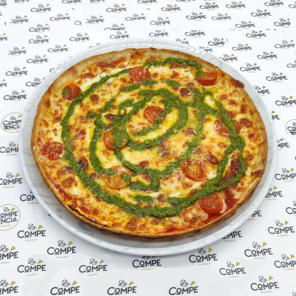 Tomate, mozzarella, crema de queso Philadelphia, tomates Cherry, parmesano, salsa de piñones al Pesto y orégano.
