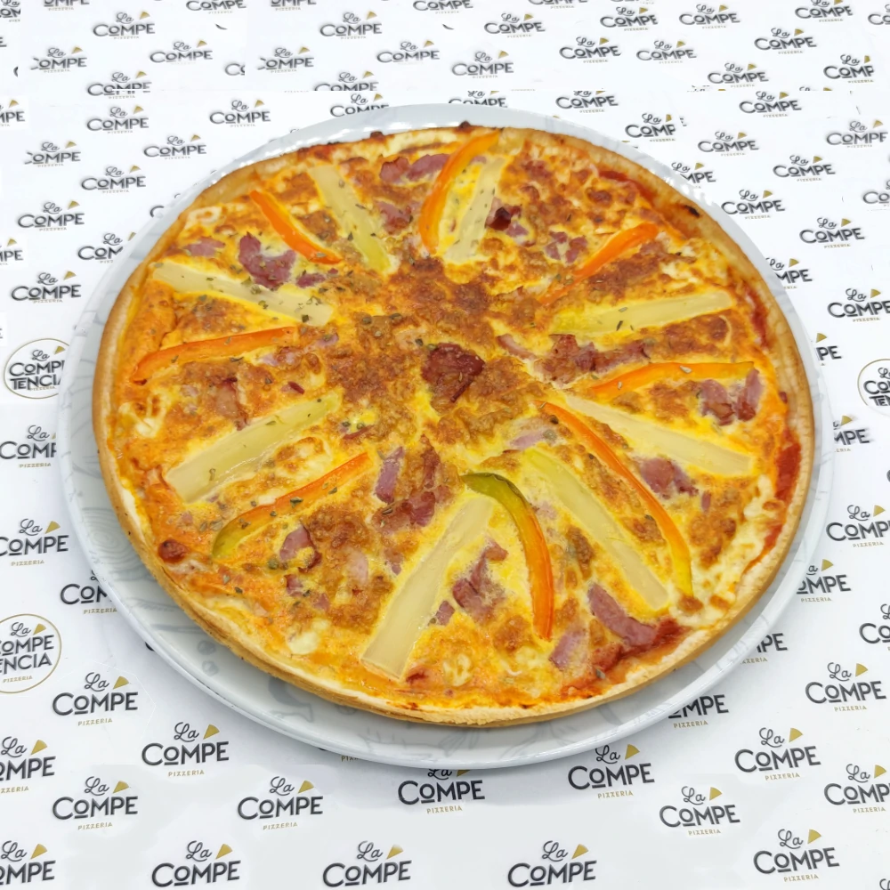 Nuestra Quiche es una deliciosa pizza que elaboramos con una base de tomate, mozzarella, trozos de bacón, espárragos frescos, pimientos y huevo batido para un toque cremoso.